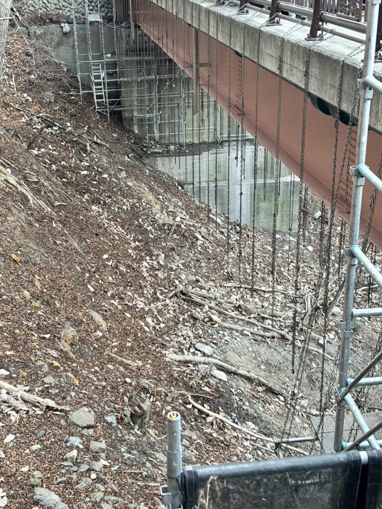 目立たない場所ですが、この足場があるからこそ、上の橋は日常を保ったまま工事が進みます。