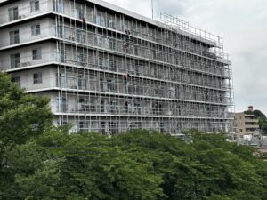 埼玉県内にて8,500㎡の大型マンション改修工事です。 戸建て住宅~大型物件まで、どんな足場でも対応いたします。
