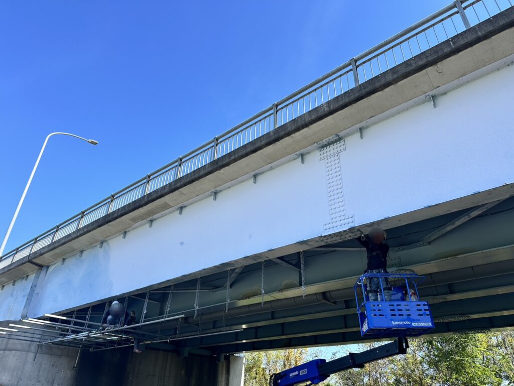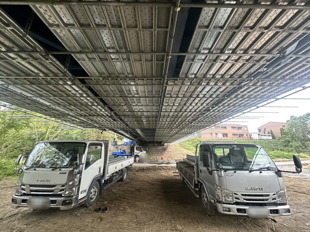 みなさんこんにちは!橋梁の裏側にて【吊り足場の施工】が順調に進んでいます😊 前回もお話した通り、吊り足場は地面から組めない場所や高所での作業に最適な足場で、橋やプラント・ビルの